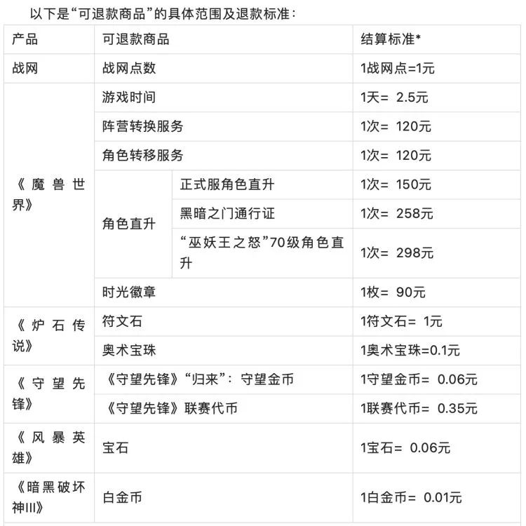 网之易退款说明显示,计划针对玩家在游戏内已充值但未消耗的虚拟货币或未失效的游戏服务,开放退款申请;并公布了包括战网点数,及《魔兽世界》《炉石传说》《守望先锋》《暗黑破坏神III》《风暴英雄》等可退款商品的现金结算标准。