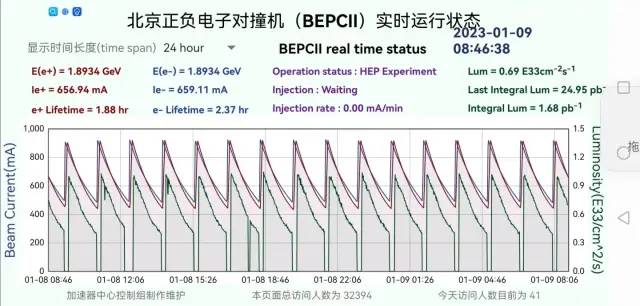 实验结果下半部分的图表,显示了加速器里面正负电子的束流强度随时间变化的曲线。
