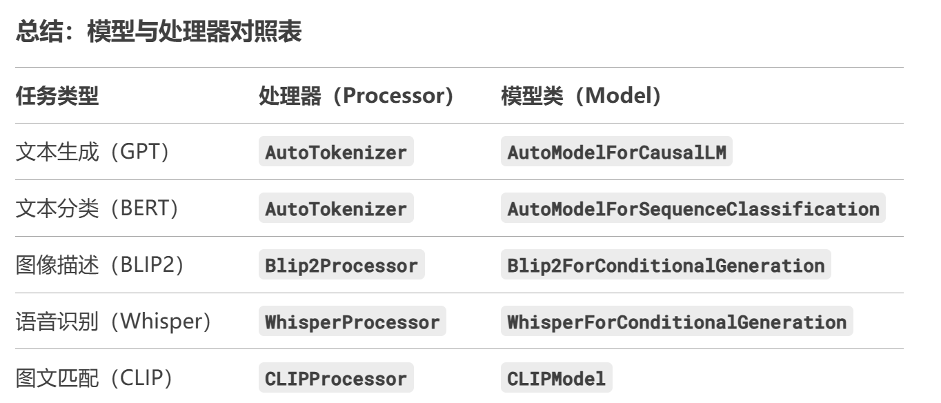 其中每种模型通常有对应的处理器(Processor)和模型类(Model Class),不同任务的模型使用方式可能不同。通常而言,无论是处理文本、图像还是多模态任务,标准的流程通常是先用处理器(Processor)处理原始输入,将原始输入(文本、图像、音频等)转换为模型可理解的格式,再把处理后的数据输入模型(Model)进行计算,执行神经网络的推理或训练,最后用处理器对输出进行后处理。Processor 处理“人→机”转换,Model 处理“机→机”计算,这种分离设计使得代码更模块化、易维护,且能灵活适配不同任务。