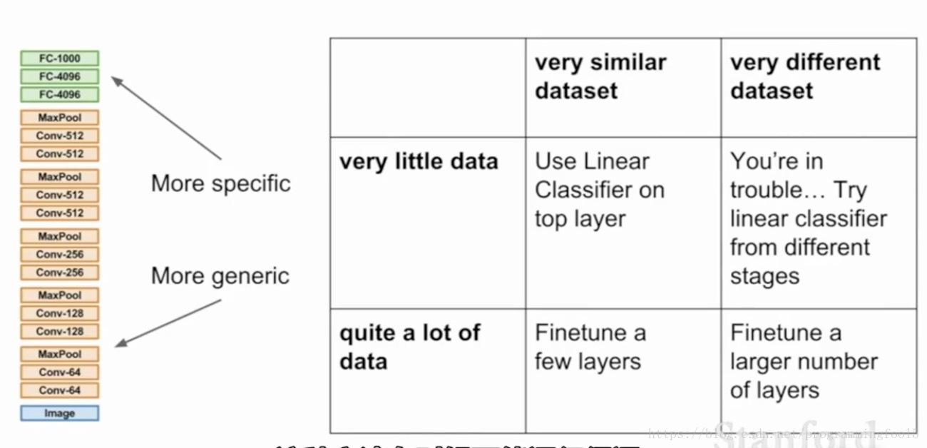 当你的数据集比较小,训练的网络过拟合,泛化能力比较差,你也可以不用大的数据集再去训练,可以采用迁移学习,即fine-tuning一个既成的网络。对于小型的数据集训练,只需要freeze前面的网络参数,然后单独学习最后的全连接层。如果你有更多的数据,那么可以逐渐训练更多的最后几层的网络。注意一个通用的策略:在学习的时候需要将学习率调的很低很低,大约只有原始训练的十分之一,因为原始的网络结构已经是收敛的了,只希望做一些微小的调整。