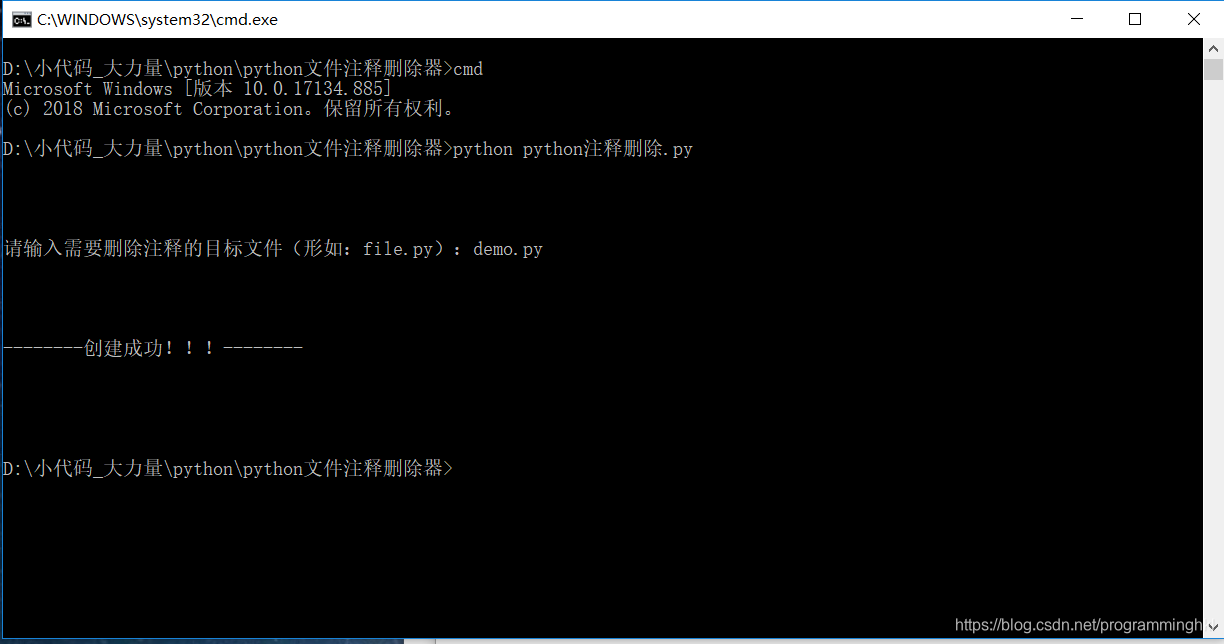 在任意位置终端(cmd)中运行此程序,将需要删除注释的.py文件,拖拽到终端窗口中。都可以在源文件路径下,生成无注释版本的文件.py 和 注释的备份 .txt文件