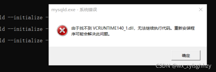 命令行初始化mysql【相当于重置密码启动mysql服务】时在输入mysqld --install或者mysqld --initialize --console报错弹框: