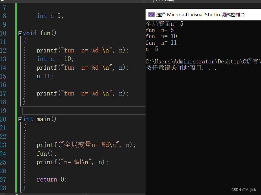 3.全局变量是定义在函数外(可以任何函数外,包含main函数)从定义处开始往下存在,存储在内存的静态存储区。函数内部定义的局部变量与全局变量重名时,函数在使用该变量的时候会以局部变量覆盖全局变量。也就是只有局部变量会起效果。在此定义域中赋值等操作时都不会使用到全局变量。当局部变量结束之后,依然使用全局变量。(局部变量的赋值不会影响全局变量的值。)
