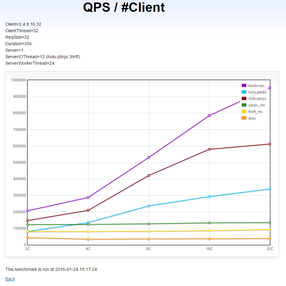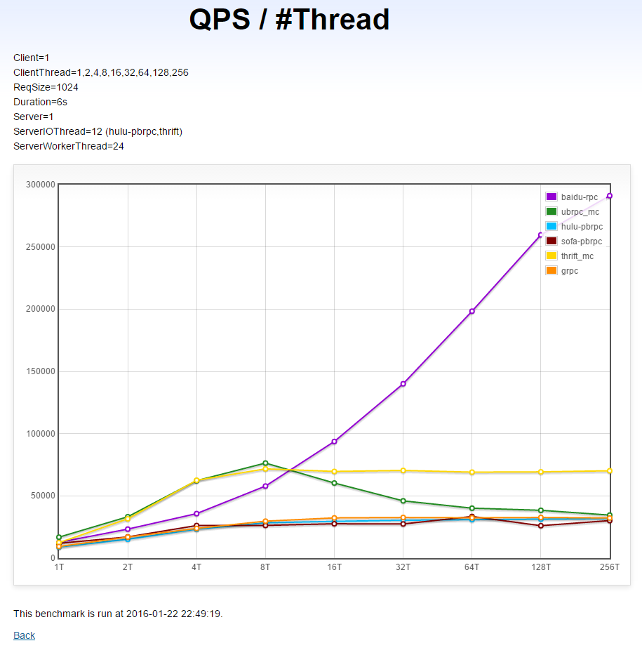 同机单client→单server在不同线程数下的QPS(越高越好)