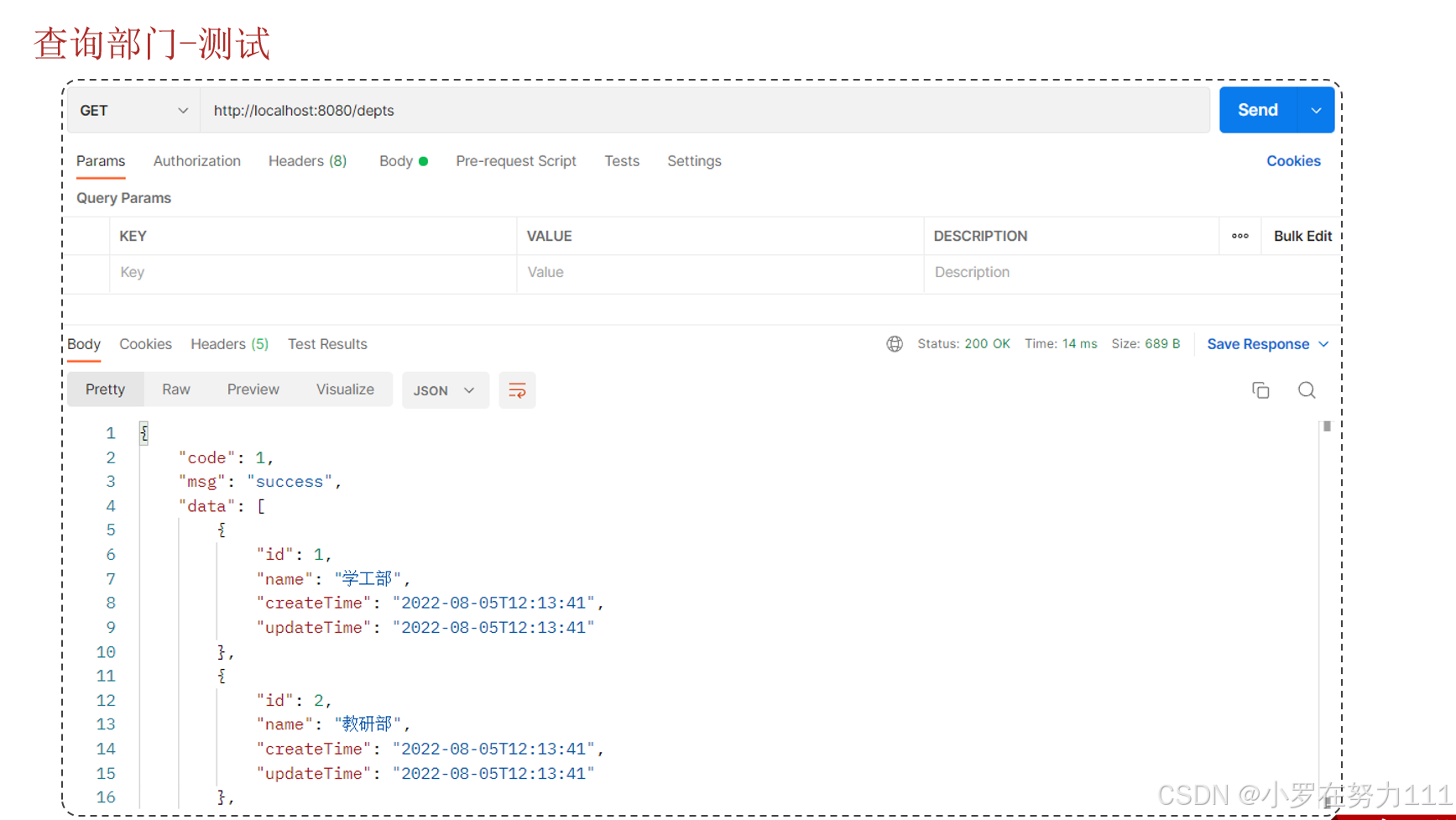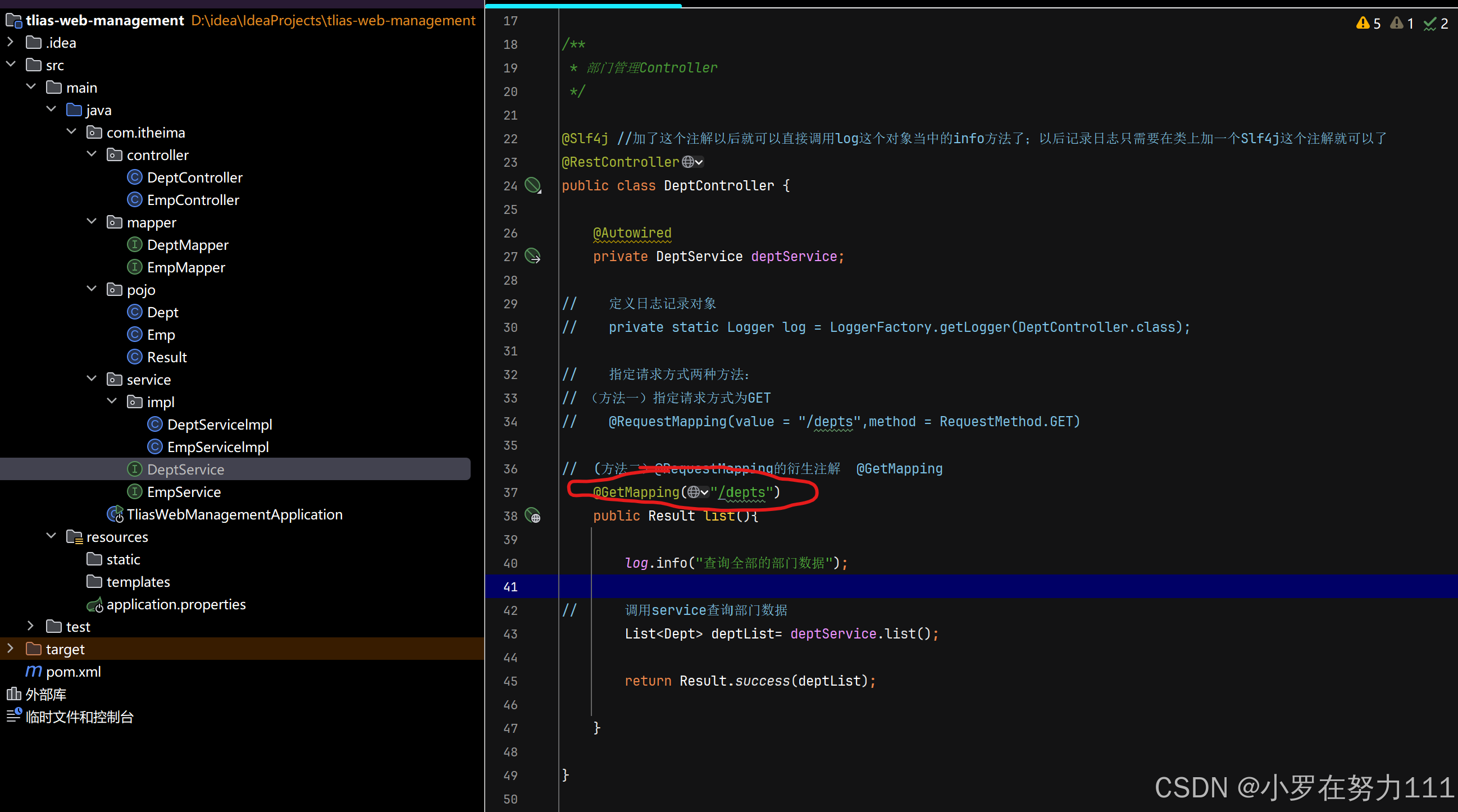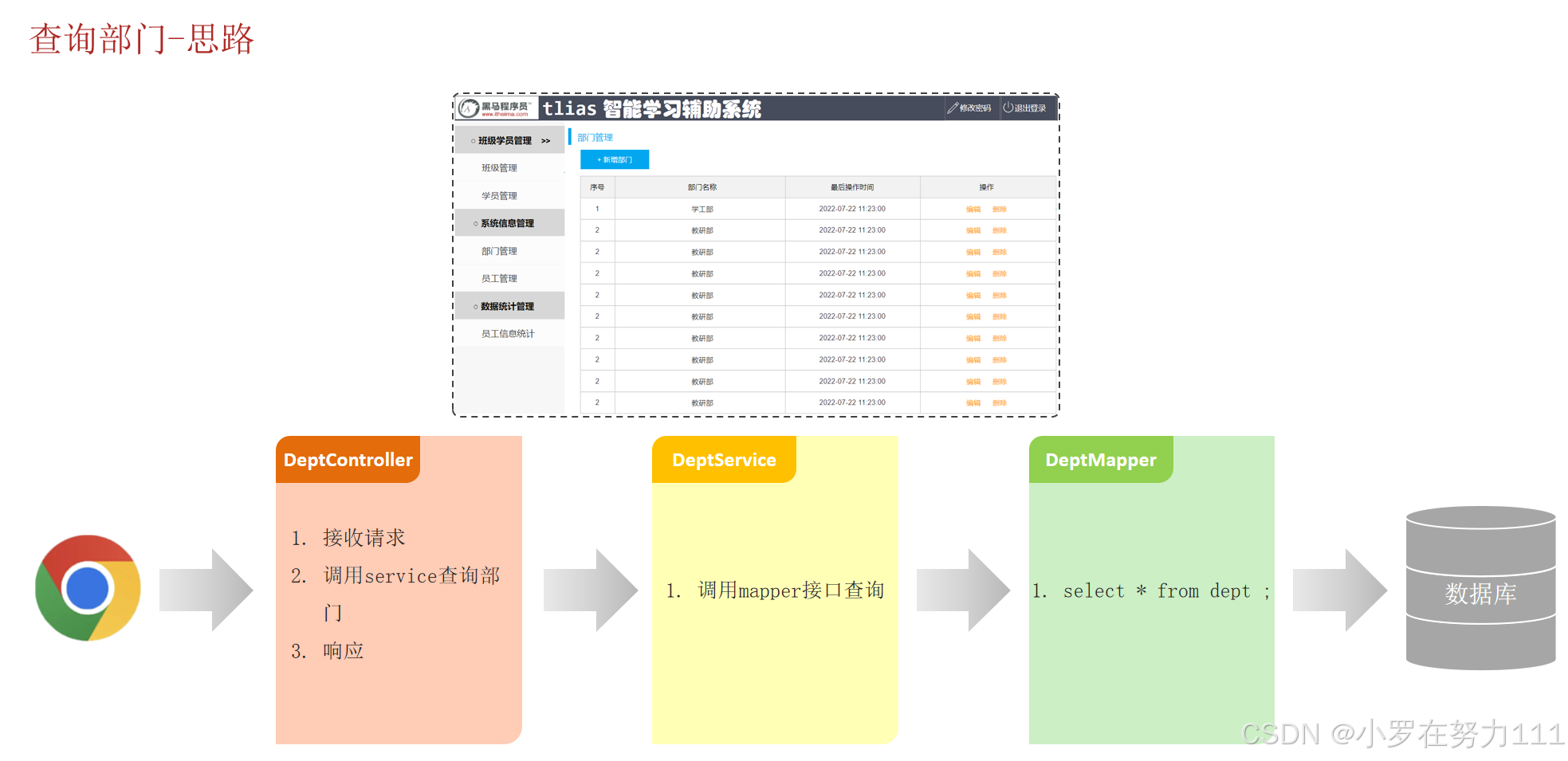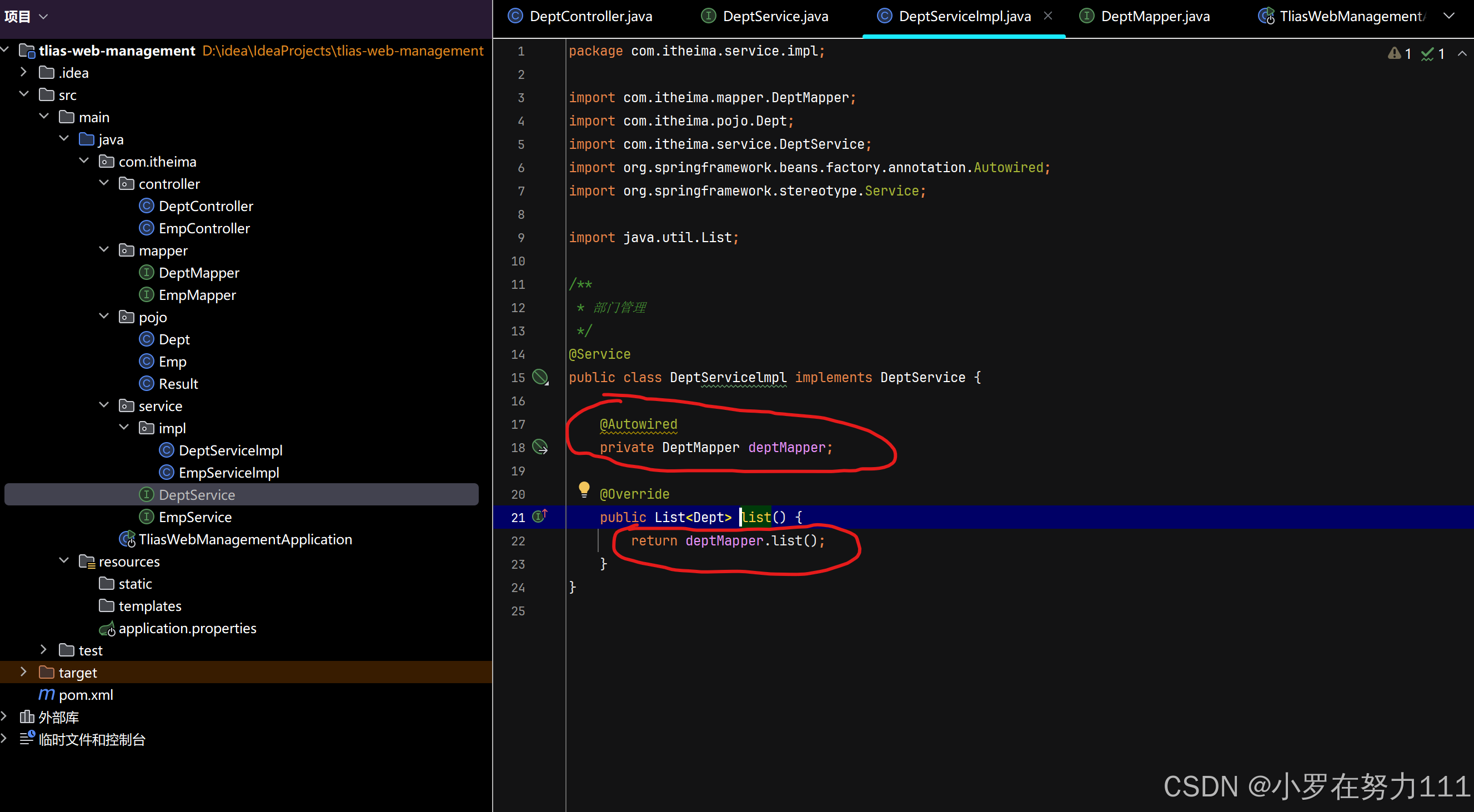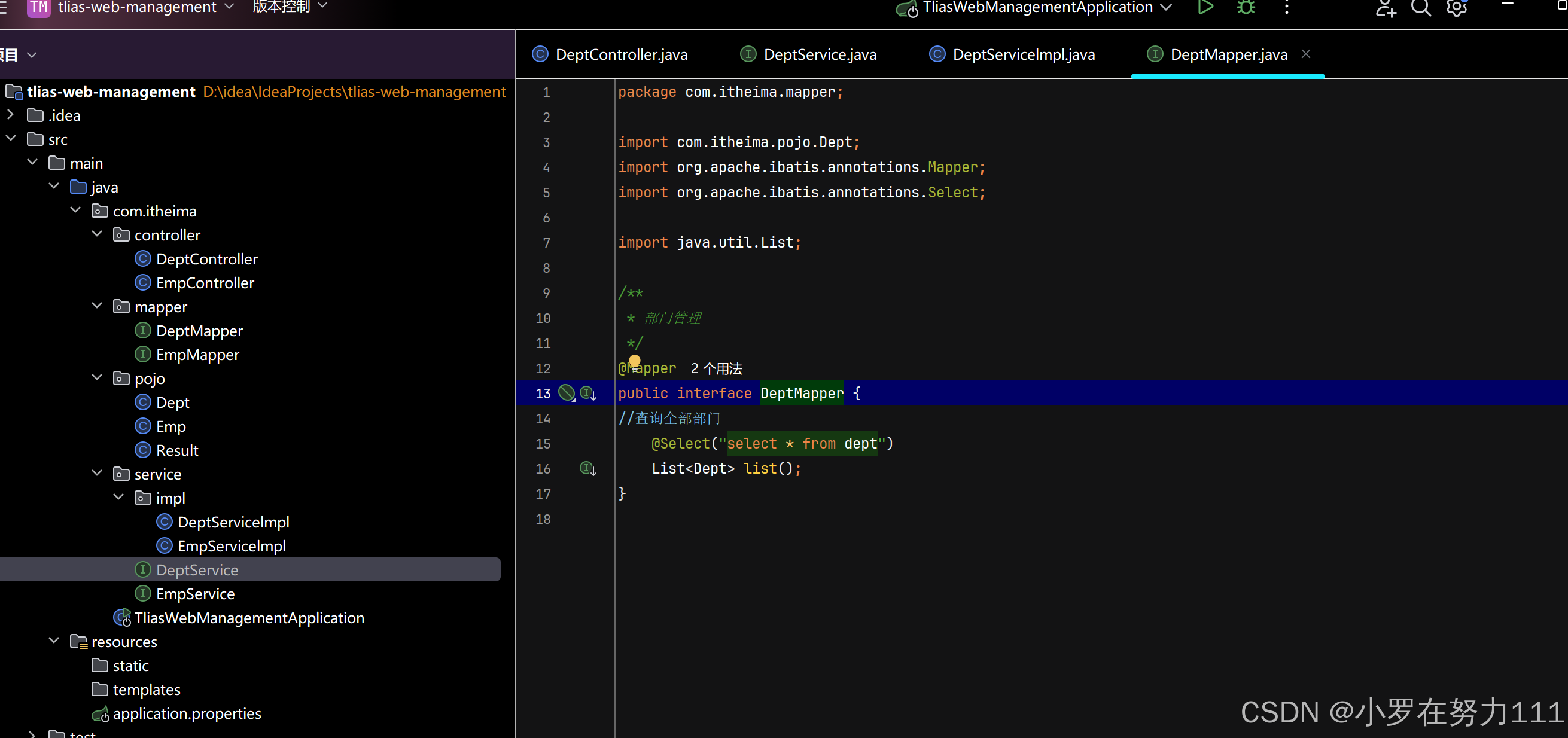 2,调用service查询部门 (先创建Deptservice类型接口对象,在Deptcontrolle的list方法里调用Deptservice层里的list方法,然后再DeptserviceImpl实体类里实现Deptservice接口方法)