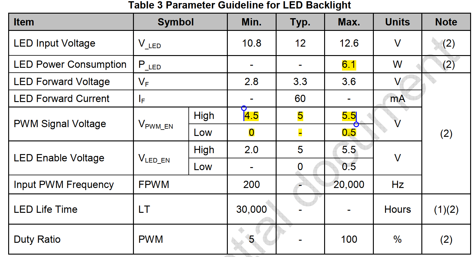 注意上述两个PWM的工作电压不同。对于高电平,第一个屏定为4.5-5.5;第二个定义为2.3-Vin。假设GPU侧给出的PWM高电平为3.3,则对于第一个屏幕,其亮度调节功能是缺失的。