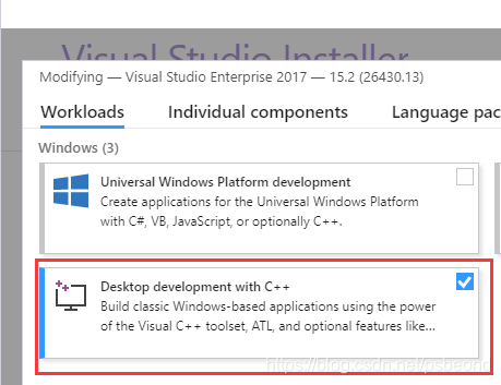 - 安装vs2019,安装的时候,Workloads选项卡必须选中“Desktop developmet with c++”,这个是驱动开发必须的。