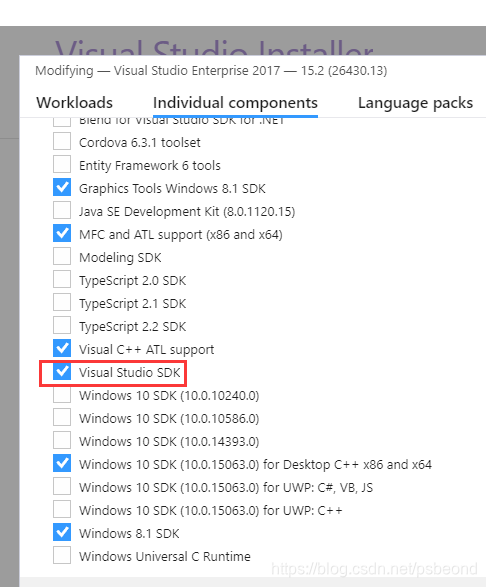 “Individual components”选项卡里,必须选中“Visual Studio SDK”(注意不是Windows SDK),这样在安装WDK的时候,才会安装VS插件(即vs开始菜单中增加Driver菜单项,且VS创建工程的时候,可以选项驱动类型的工程模板)。