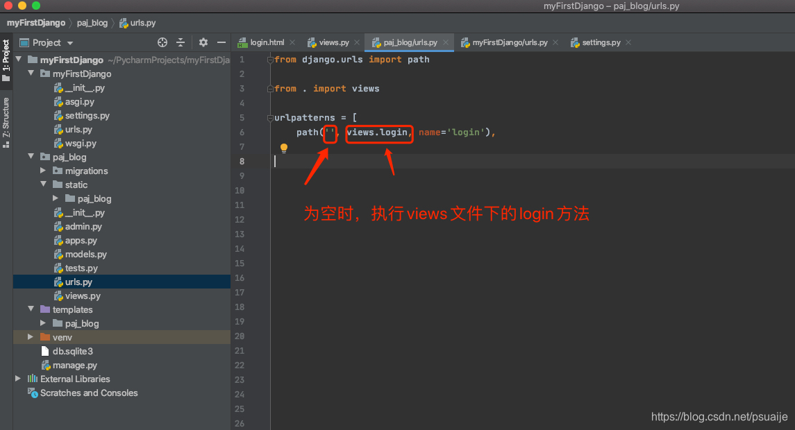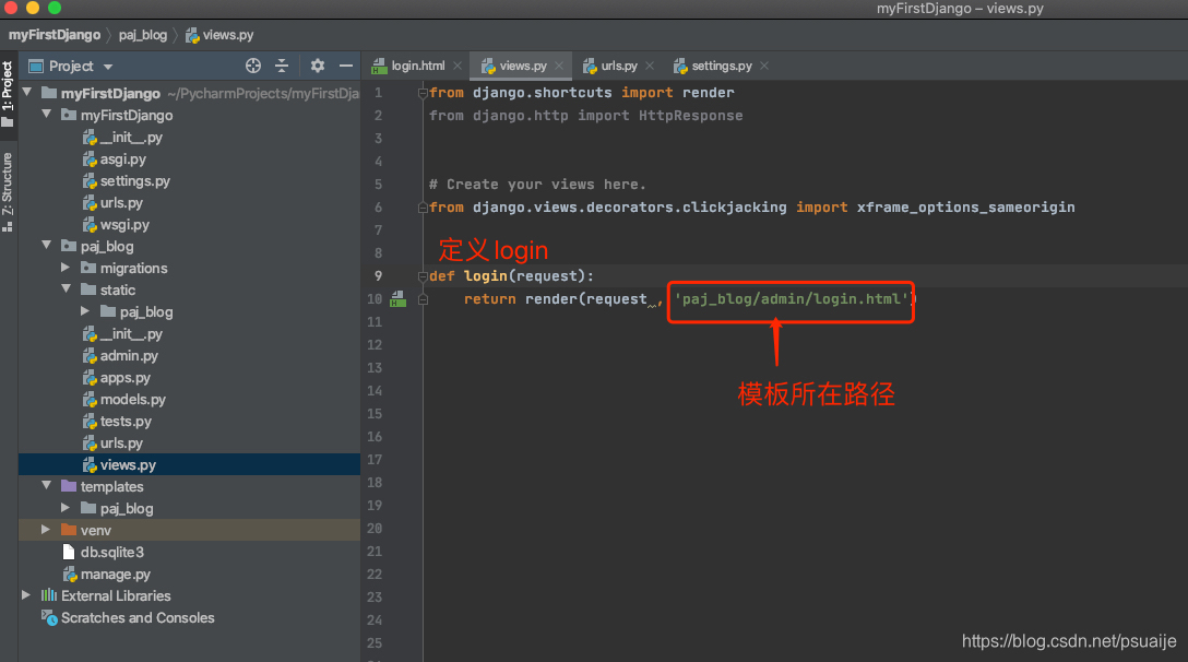 2.依次在项目目录中创建模板文件夹,myFirstDjango(项目根目录)---->templates(存放模板的根目录)--->paj_blog(用于区分哪个应用的模板)--->admin(用于区分前台还是后台的模板)