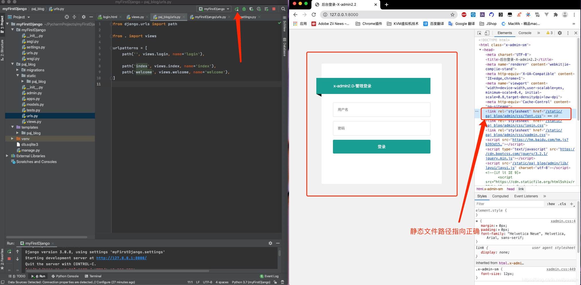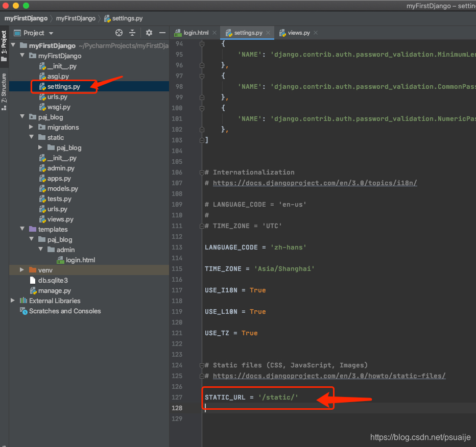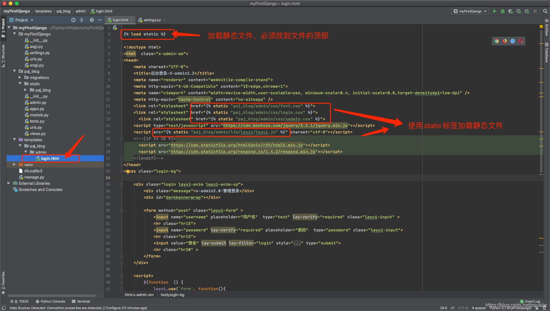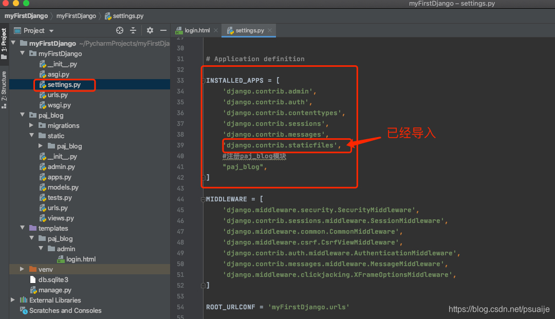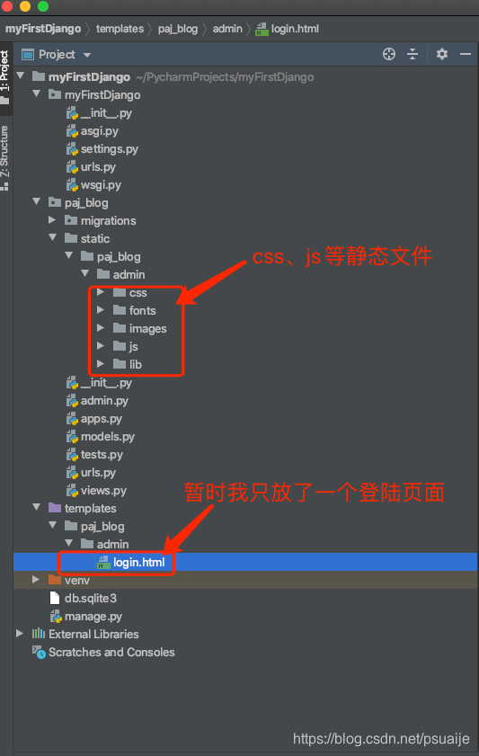 1.依次在应用文件夹下创建,myFirstDjango(项目根目录)--->paj_blog(应用目录) --->static(静态文件目录)--->paj_blog(随便起,用于区别静态文件用于哪个应用)--->admin(用于区别是前台的还是后台的文件)