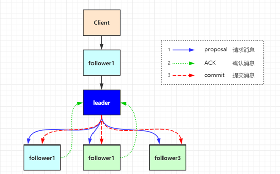 - client向zk中的server发送写请求,如果该server不是leader,则会将该写请求转发给leader server,leader将请求事务以proposal形式分发给follower;