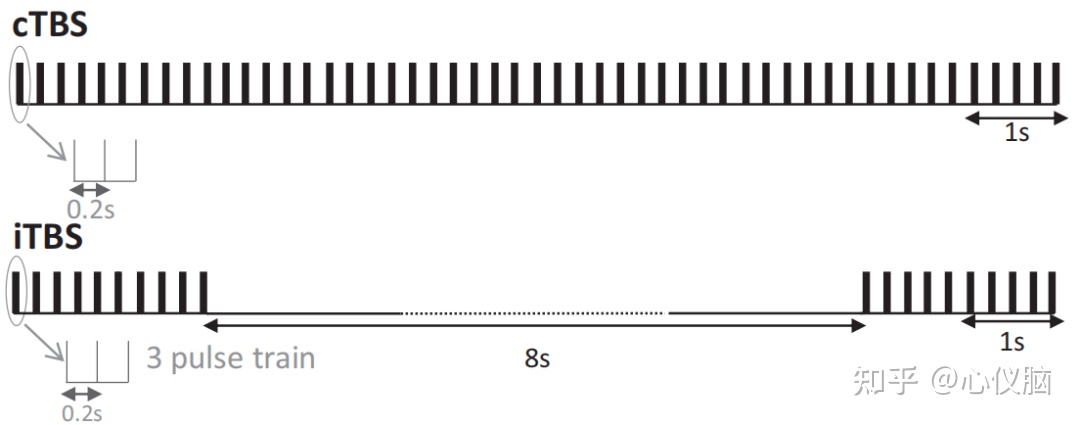 爆发式刺激的频率与大脑海马体theta波的频率类似,属于模式化重复刺激的一种,以丛为单位,每丛有3个爆发式脉冲,从内频率50Hz,从间频率5Hz,具有刺激时间短、作用时间长、更接近神经生理活动生理状态等优势。不同模式的TBS对神经元兴奋性也有不同的影响。间歇式的TBS(iTBS)为连续刺激2s,间隔8s,可以提高神经元兴奋性;持续性的TBS(cTBS)则以5Hz的频率持续进行刺激,可以降低神经元的兴奋性。