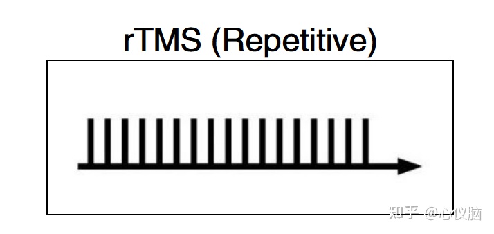 以固定的刺激频率连续刺激的模式,通常用于临床治疗和暂时兴奋或抑制特定皮层功能区域。≤1Hz的为低频刺激,可以降低神经元兴奋性;>1Hz的为高频刺激,可以提高神经元兴奋性。在目前的临床治疗中,如果刺激频率≥5Hz,就会在刺激过程中设置刺激间歇(ITI)。刺激频率越高,刺激间歇越长。某些情况下,高频的rTMS带来的效应可以持续90分钟。当然,刺激间隔时间也必须按照治疗协议来确定,例如,在抑郁症的高频rTMS治疗中,ITI=15s;在抑郁症低频rTMS治疗中,ITI=1s。