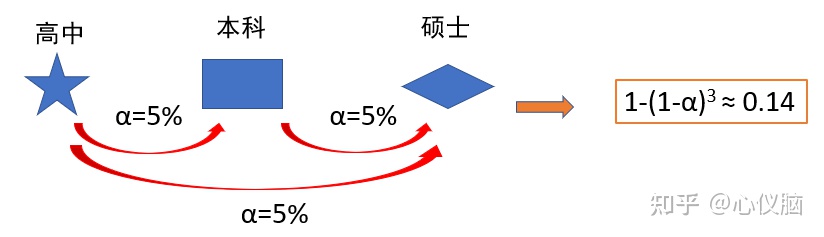 我们来举个栗子,比如研究者想要探究不同的受教育程度的收入情况之间是否有差异。方差分析研究结果已经表明高中、本科、硕士三种受教育程度的收入是有显著性差异的,需要进一步去探究哪两者是有差异,哪两者之间是没有差异的。三种情况两两之间需要进行三次比较,如果采用t检验,每次比较我们犯“弃真”错误的概率是5%,那比较三次,我们累计犯“弃真”错误的概率约等于0.14。也就是说,我们在一次试验中比较的次数越多,犯一类错误的概率就越大,那也就是为什么会选择多重比较。