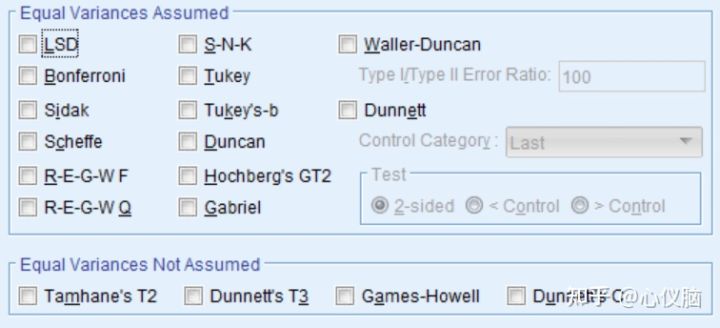 SPSS给分析者提供了多种多重比较的方法,根据方差是否齐性分成两部分,其中方差齐性提供了14种方法,方差不齐提供了4种方法。在众多选择中该如何进行选择了?
