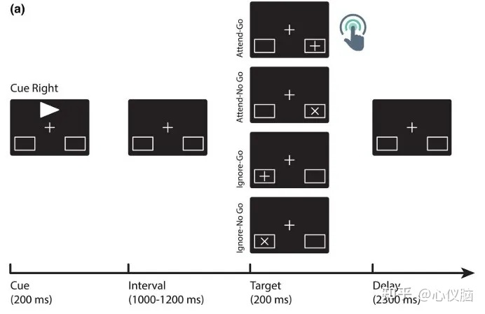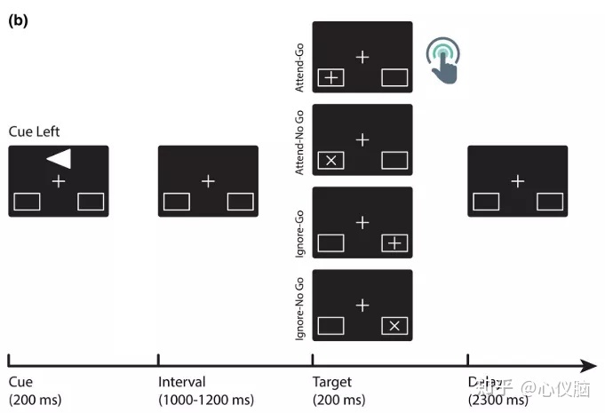 被试需要完成Go/NoGo任务。如下图(a)、(b)所示,在每个试次的开始会以左右箭头的方式提示接下来需要注意的方向,当在需要注意的方向上出现“+”时,被试需要尽可能快地作出按键反应。除此之外,即当需要注意的方向上出现“x”,以及不需要注意的方向上出现“+”或“x”时,均无需作出反应。