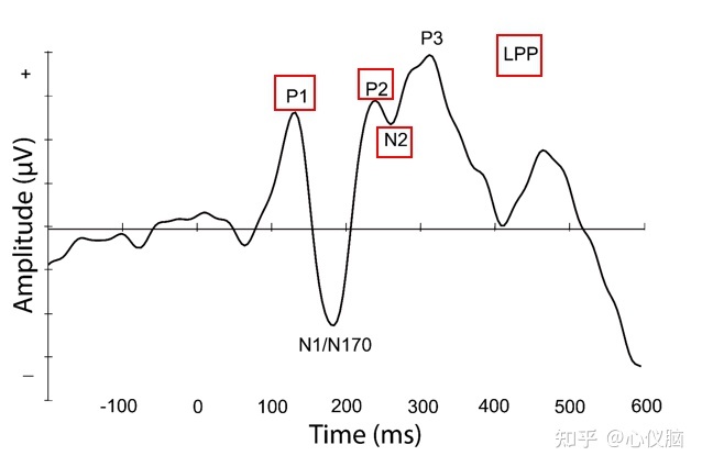 N2,在进行认知控制任务中,可以观察到其出现的时间在200ms-350ms内,主要反映认知加工后期的注意控制能力。N2pc,已用于认知心理学中揭示隐蔽的视觉注意超过25年,主要用来与选择性注意相关联。LPP在刺激呈现200ms后出现,在刺激结束后1000ms依然存在。主要反映的是注意对情绪图片的持续性投入,并且LPP的出现、持续时间和振幅受到任务相关因素的影响。比如说,与中性效价的图片相比,它的振幅会因为图片的正负性效价而增加。除此之外,LPP也是可以作为情绪调节作用的参考指标,并高度依赖于空间注意分配。例如,在实验过程中当没被注意的位置上出现厌恶性图片时,LPP的情绪调节不会出现。