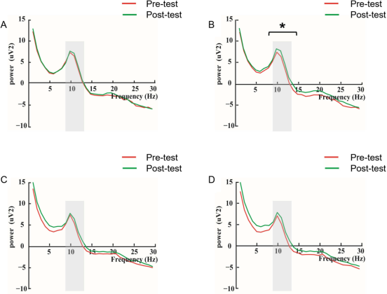 图3 两组受试者左右额叶的平均功率谱密度(PSD)。(A)长期组在练习前后左额叶三个电极位点(Fp1, F3, F7)平均PSD的差异;(B)长期组在练习前后右额叶三个电极位点(Fp2, F4, F8)平均PSD的差异;(C)短期组在练习前后左额叶三个电极位点(Fp1, F3, F7)平均PSD的差异;(D)短期组在练习前后右额叶三个电极位点(Fp2, F4, F8)平均PSD的差异