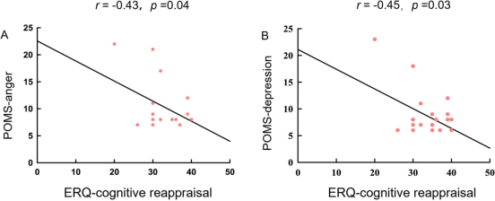 图2 相关性分析。(A)长期组认知重评与愤怒负相关;(B)长期组认知重评价与抑郁呈负相关