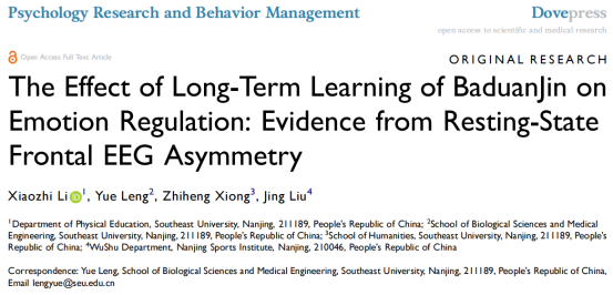 东南大学生物科学与医学工程学院冷玥团队在Psychology Research and Behavior Management期刊发表了题为“The Effect of Long-Term Learning of BaduanJin on Emotion Regulation: Evidence from Resting-State Frontal EEG Asymmetry”的研究论文,旨在探索八段锦对情绪调节的影响及其背后的神经机制。