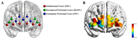 图4 (A) 显示了眶额皮质(OFC)通道的对齐情况;(B) ASD-TD组在复杂面孔(CF)和表情符号面孔(EF)条件下的氧合血红蛋白(HbO)浓度