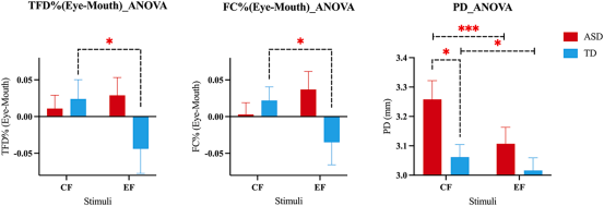 研究结果显示,ASD儿童在观看快乐面孔时表现出与TD儿童显著不同的注视模式和大脑反应。具体而言,相较于TD儿童,ASD儿童在观看所有快乐面孔时瞳孔直径更大,表明更高的自主唤醒水平,并且眶额皮层(OFC)的激活也更强,这可能反映了对这些刺激的不同处理方式。然而,ASD儿童较少注视实际面孔的眼睛区域和表情符号的嘴巴区域,显示出他们独特的面部信息处理策略。