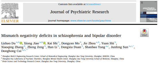 上海市精神卫生中心孙俊峰及上海交通大学崔东红等研究团队联合于期刊Journal of Psychiatric Research上发表了题为“Mismatch negativity deficits in schizophrenia and bipolar disorder”的研究论文,基于中国人群的大规模样本,系统分析了SCZ和BPD患者的MMN表现,并结合脑电频谱与同步性分析,揭示了两类疾病在听觉信息处理上的神经机制差异。