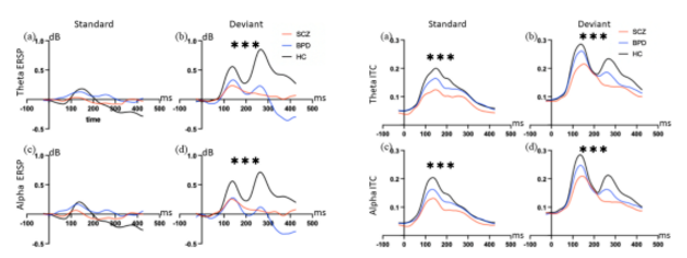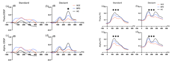 通过事件相关频谱扰动(ERSP)和试验间相位相干性(ITC)分析发现,SCZ患者在θ(4-7 Hz)和α(8-12 Hz)频段的ITC和ERSP显著低于HC。特别是在处理标准和偏差刺激时,SCZ患者表现出更弱的神经同步性和功率变化。虽然程度较轻,但BPD患者同样显示出这些测量值的降低趋势。