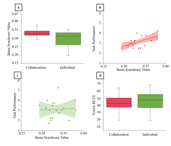 图3 (a)合作条件下的脑同步性(红)显著高于个体条件(绿);(b)合作条件下脑同步性与任务表现呈正相关;(c)个体条件下两者无显著相关;(d)合作条件下主观认知负荷低于个体条件