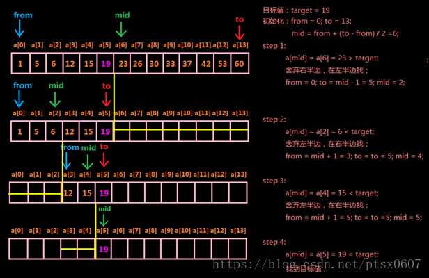 因为a[mid]处在数组的中间位置,所以它的左侧或者右侧都是数组的一半,这样每一次我们通过a[mid]和target的比较就可以排除掉一半的数据。最后只有两种情况,要么我们找到了目标值,要么我们排除了所有数据没有找到目标值。