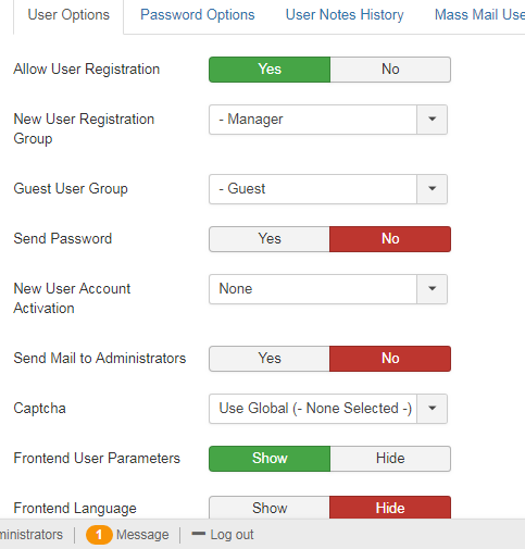 所以网站建好先用admin账户进后台/administrator/,左边User面板,右上角options设置一下。