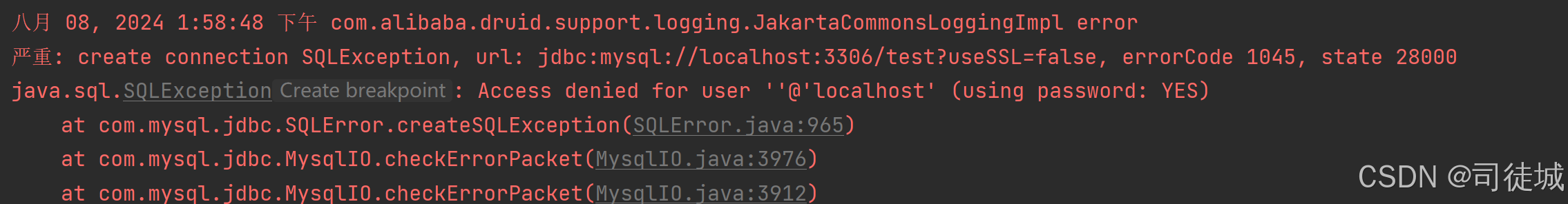 1.用户名密码错误,使用navicat连接成功说明用户密码没有错误