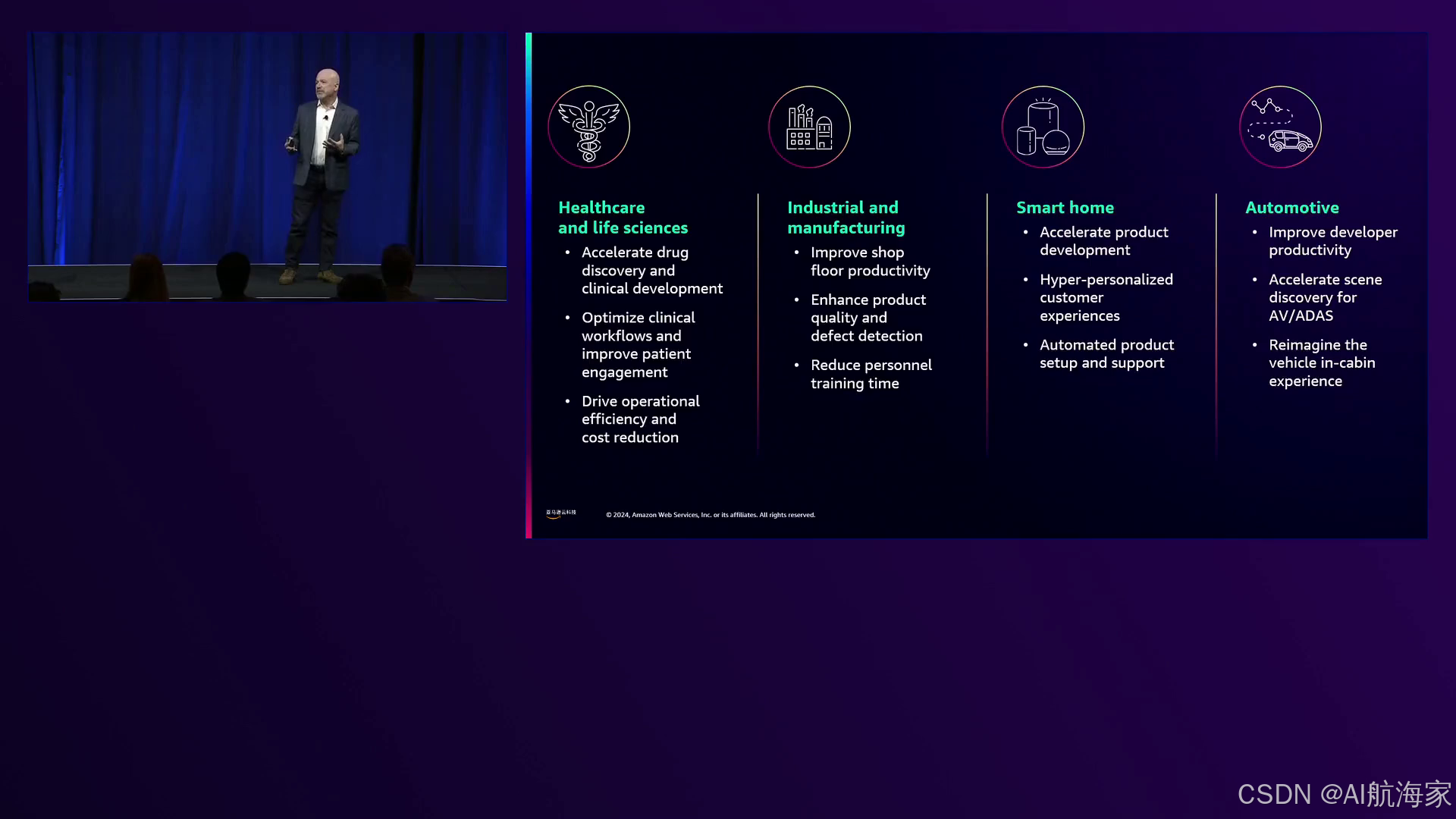 亚马逊云科技首席执行官强调了利用人工智能处理物联网数据在制药、制造和智能家居等关键行业中加速创新的步伐,承诺创造一个更美好的世界。
