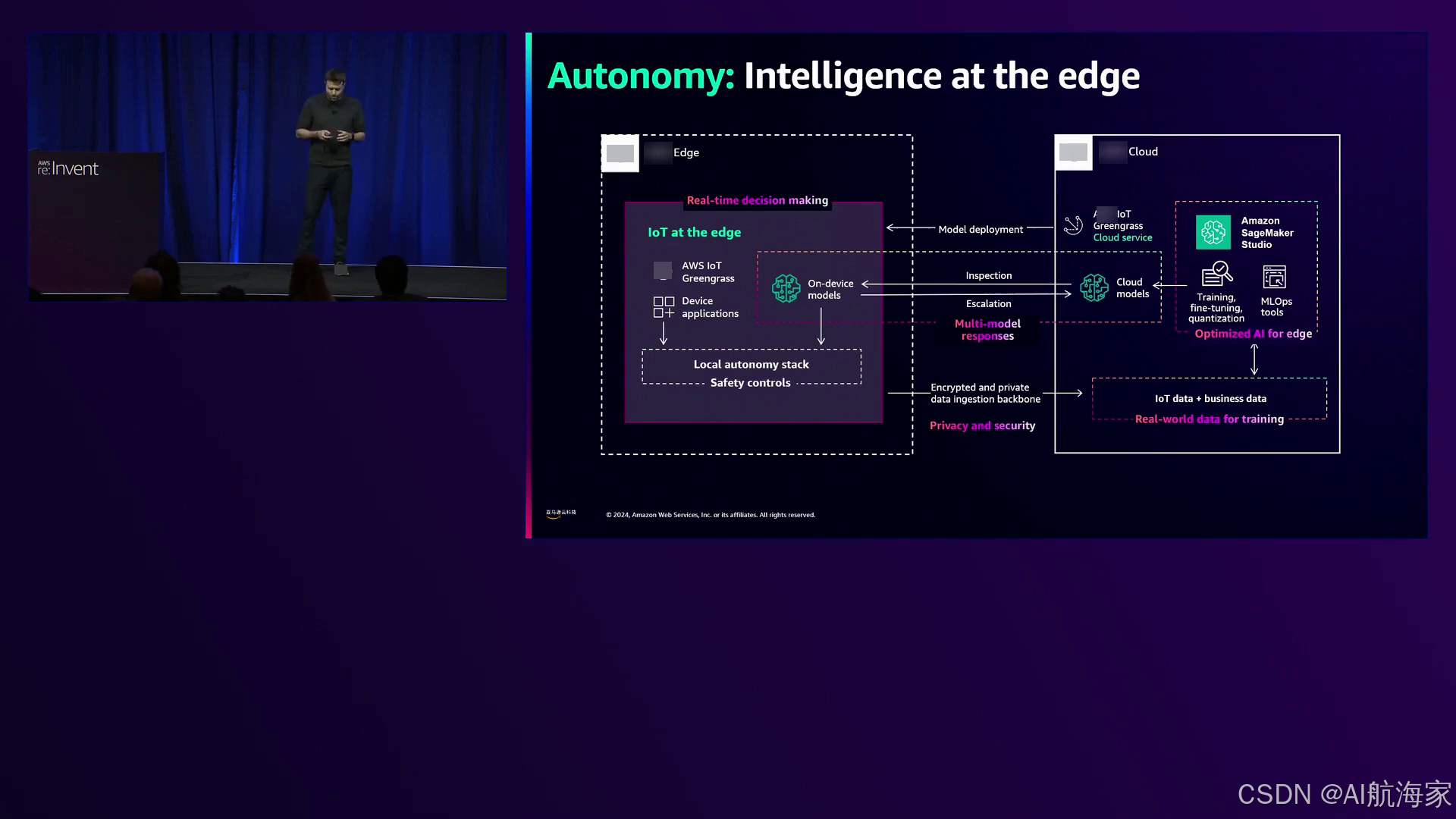 演讲接着探讨了IoT和AI的新兴模式,如增强连接产品体验、通过边缘计算和AI加速器实现自主性,以及通过机器人和自主系统将智能引入边缘。提供了真实世界的示例和架构,展示了结合IoT数据、边缘计算和生成式AI模型(如Amazon Bedrock)的强大功能。