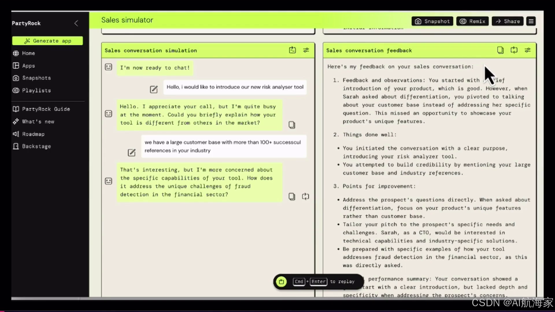 其中一个例子涉及一位销售人员,他希望模拟客户对话,利用生成式人工智能创建真实的人物和场景。通过描述客户的简介为一家大型金融服务提供商的首席技术官,产品是一种先进的生成式人工智能和风险管理解决方案,以及一个通过冷线呼叫介绍该解决方案的背景,游乐场生成了一段动态对话。其中包括来自一个风险规避型人物的常见问题和反对意见,让销售人员可以完善自己的方法,预测挑战,并最终提供更有效的销售陈述。