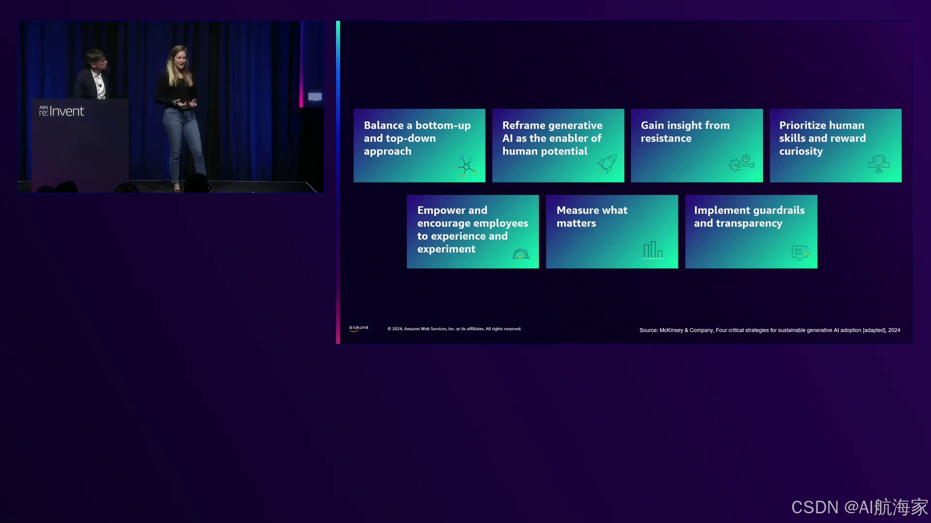 Siggi和Brittany的见解不仅局限于亚马逊,还为各行业的组织提供了宝贵的经验教训。他们鼓励与会者探索亚马逊的产品,包括一系列创新原则和领导力框架,这些可以指导大规模采用生成式人工智能的旅程。值得注意的是,亚马逊的文化强调“发明和简化”和“学习和好奇心”等原则,这与成功采用生成式人工智能所需的心态一致。