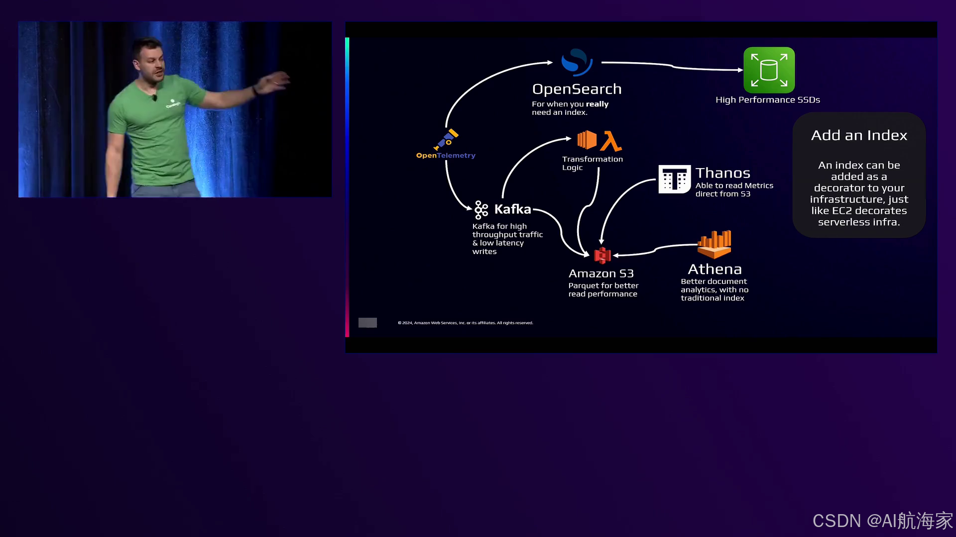 Chris是一位经验丰富的软件工程师,也是全栈可观测性平台Coralogix的倡导者。他在亚马逊云科技 re:Invent 2024大会上发表演讲,向观众介绍了“无索引可观测性”的概念——一种旨在更高效处理数据、降低传统索引方法成本的架构模式和数据管理理念。
