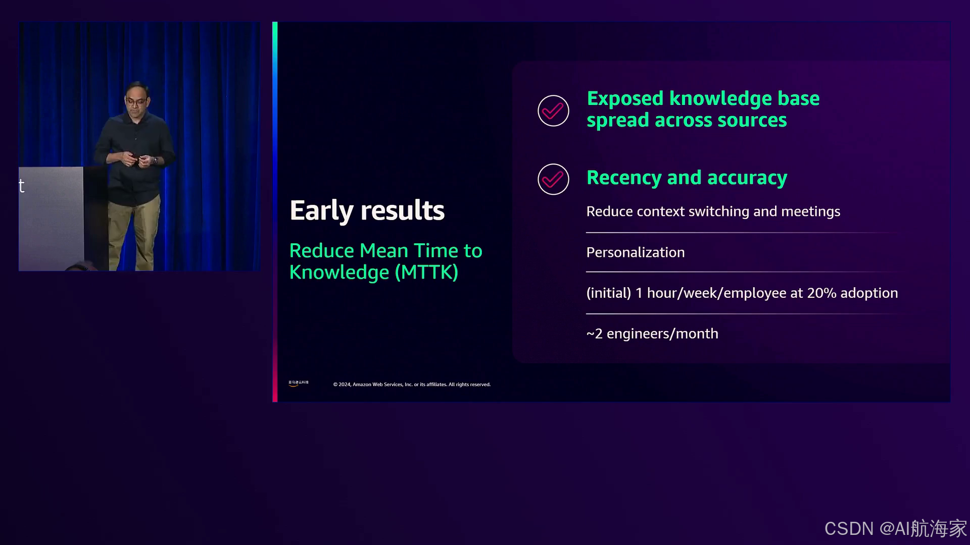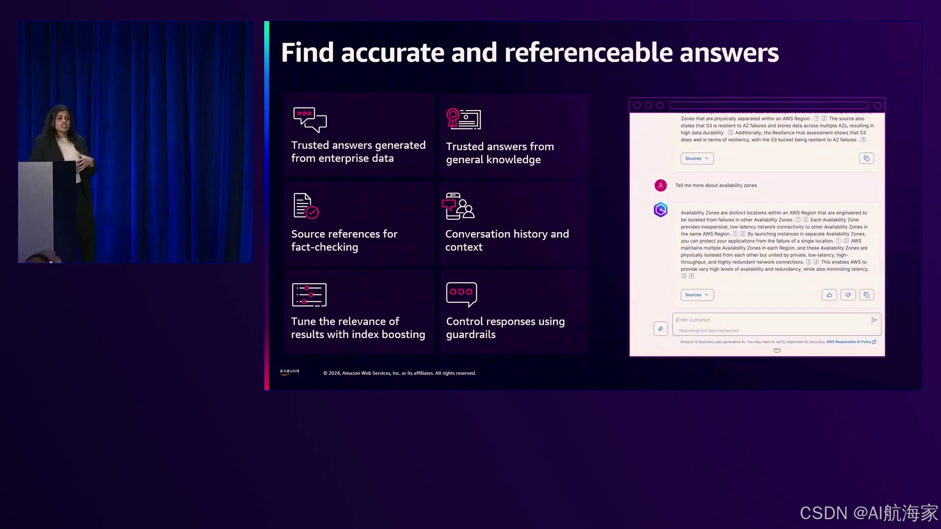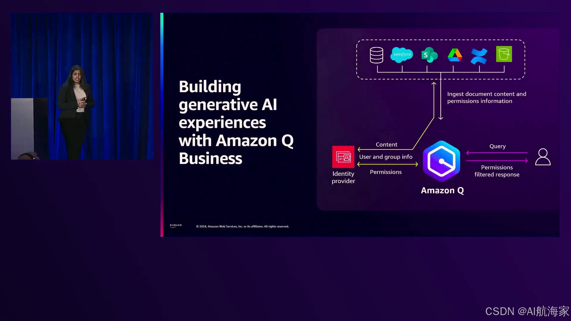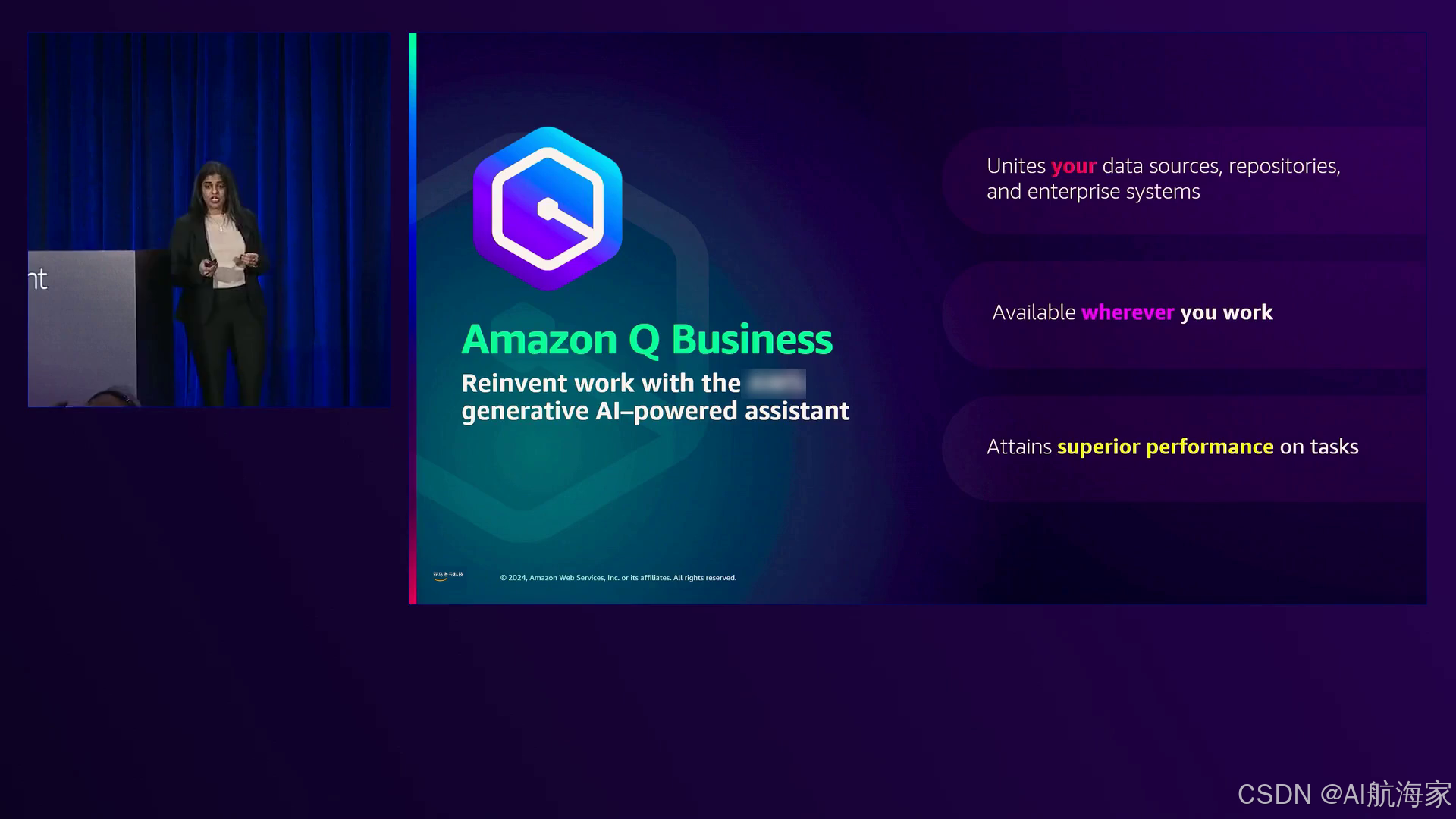 关键字: [Amazon Web Services re:Invent 2024, 亚马逊云科技, 生成式AI, Amazon Q Business, Employee Productivity, Amazon Q Business, Enterprise Data Sources, Knowledge Management, Personalized Information Retrieval]
