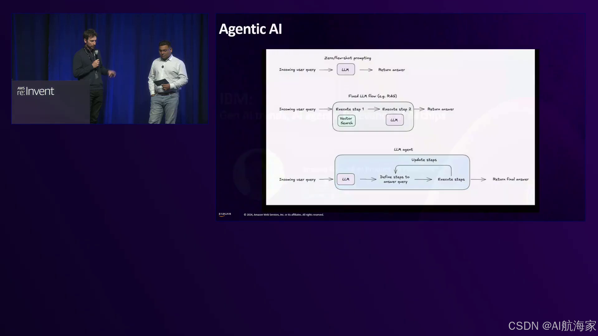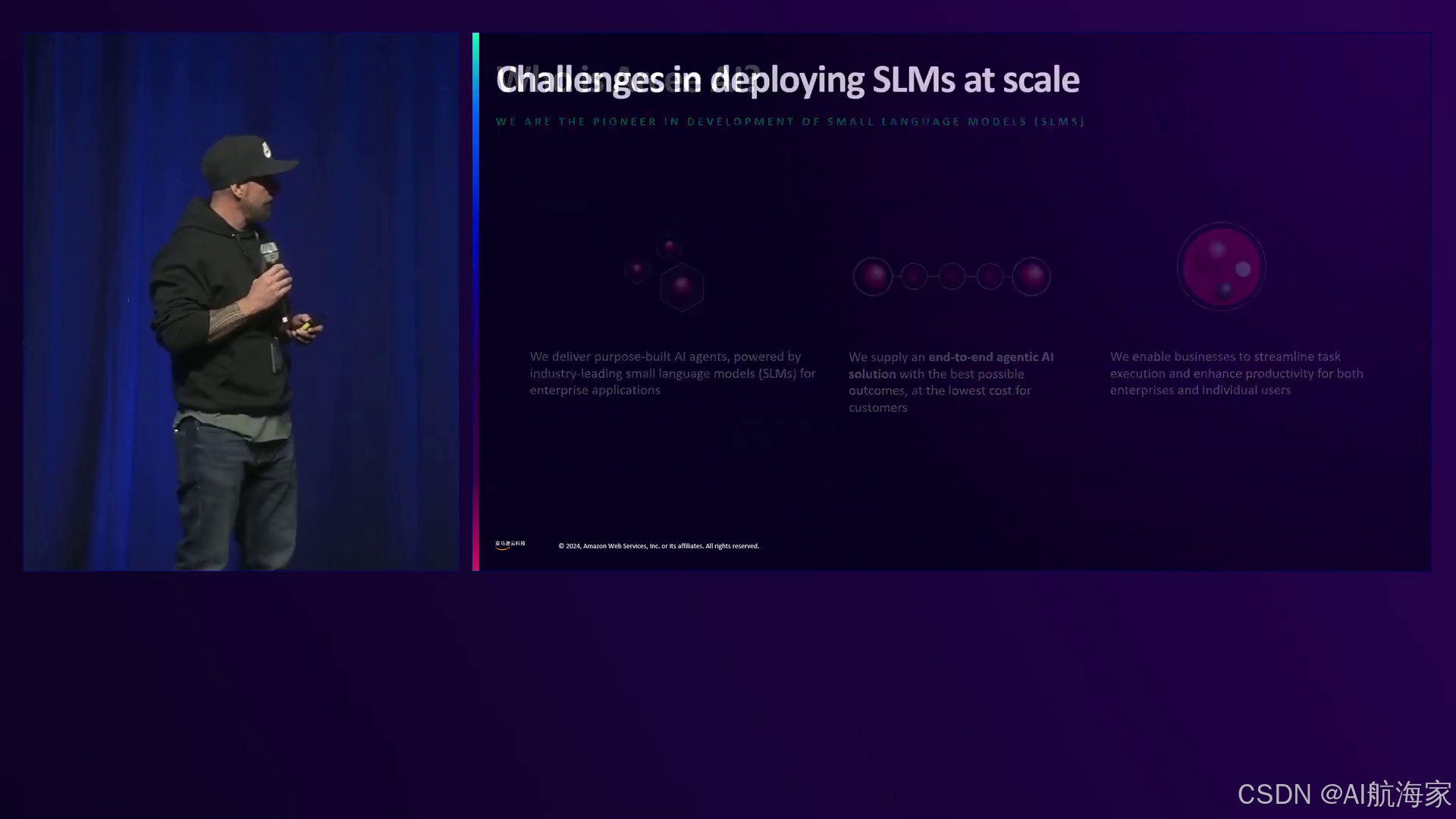 亚马逊云科技的首席genAI专家Dewa Cribbenzo介绍了这场会议,概述了genAI的主导趋势,包括更大的语言模型、更小的模型、多模态模型和AI代理。他强调亚马逊云科技在AI芯片如Trinium 2上的投资,可为genAI工作负载提供卓越的性能和成本效益。