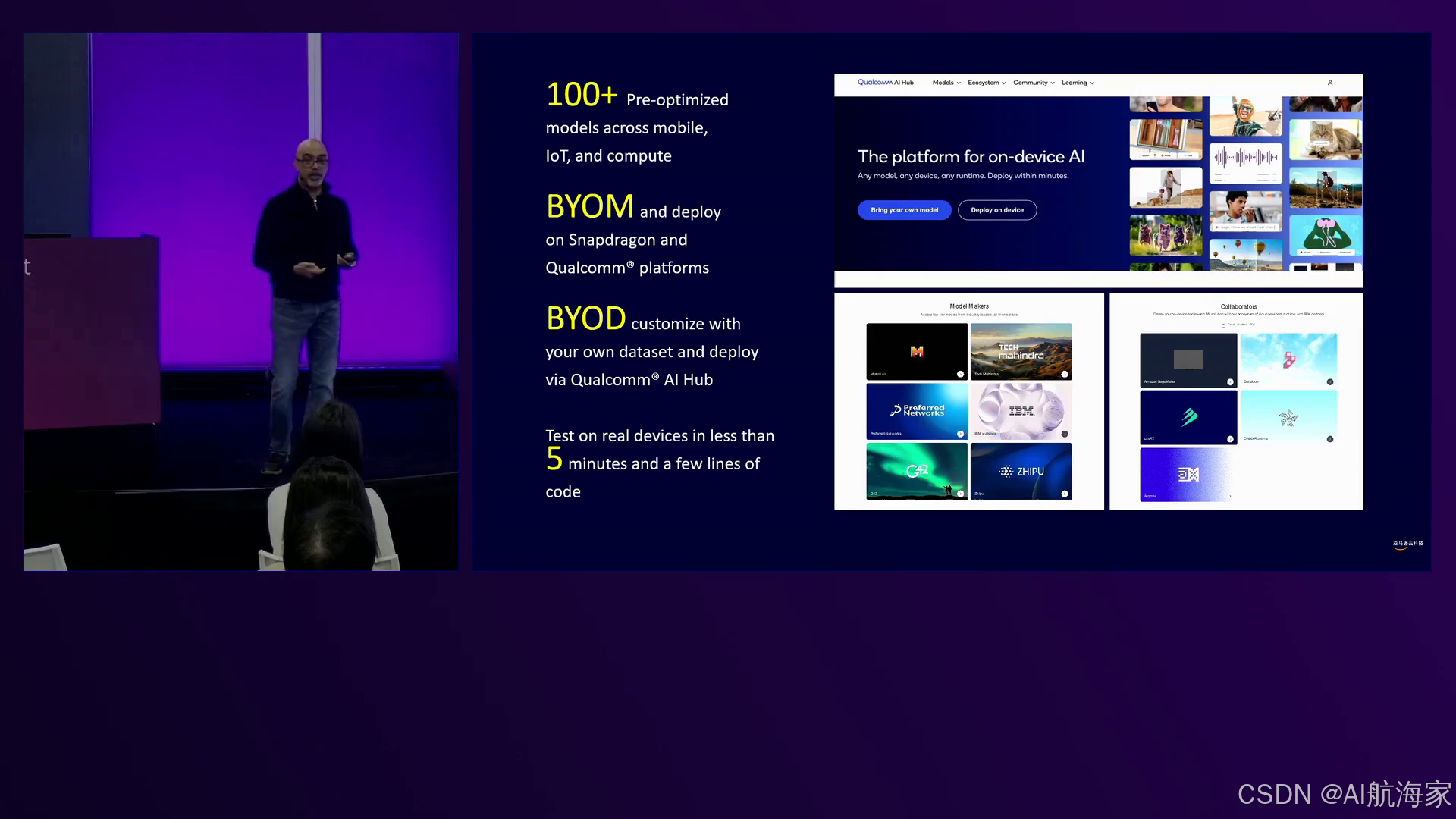 Qualcomm的AI Hub简化了开发者的工作流程,提供了一个无缝平台,用于针对特定硬件微调AI模型、优化性能并部署设备上的AI应用程序。开发者可以利用现有模型,引入自己的模型和数据,并与Amazon SageMaker等云平台无缝集成。这种端到端的流程线将模型训练到设备部署的过程简化了,从而实现了快速迭代和创新。