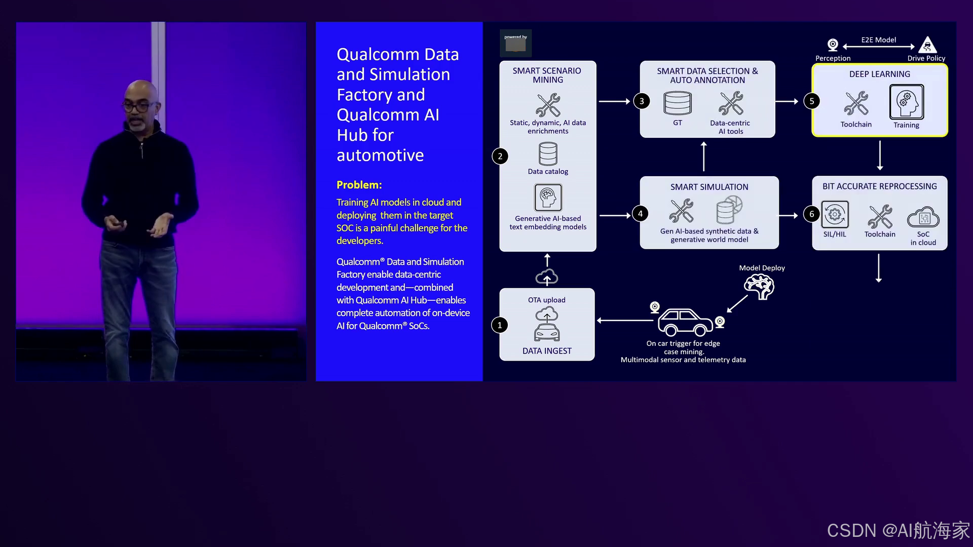 Palgat阐述了这一用例的数据驱动管道,其中汽车检测到的边缘案例或异常会被整合到云端,进行场景挖掘、数据丰富和自动标注等高级人工智能技术处理。然后,数据通过深度学习管道,涉及Qualcomm AI Hub进行设备量化、使用云端Qualcomm SoC进行位精确测试,以及高级分析来评估模型性能。