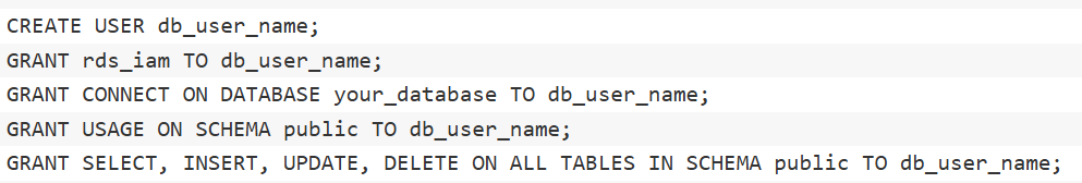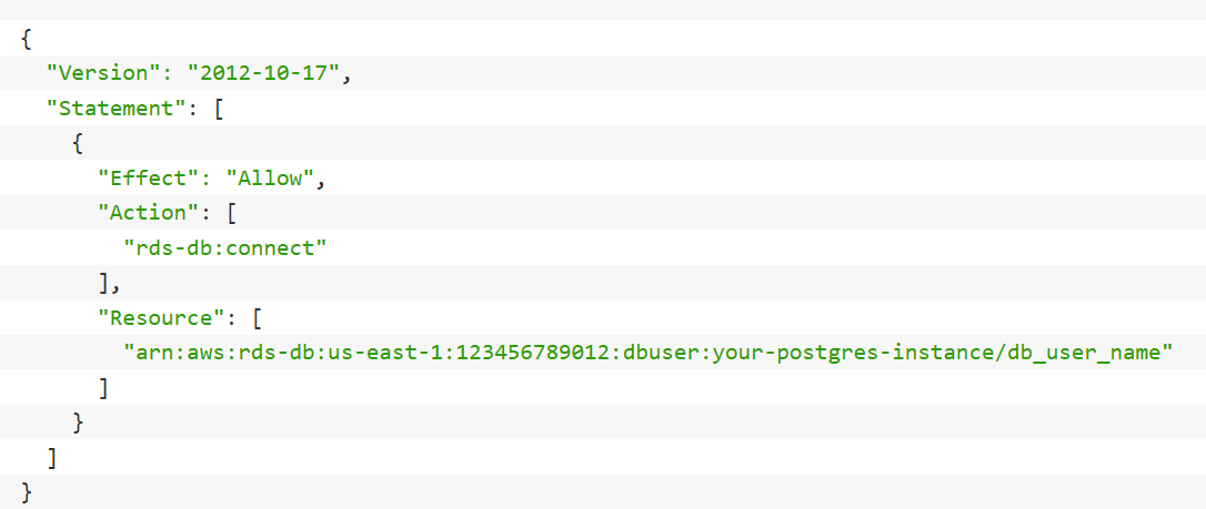 确保IAM角色具有正确的rds-db:connect权限,并且资源ARN与实际的数据库实例和用户名匹配。