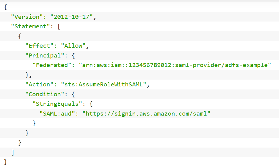 | iamIdpArn | 是 | IAM身份提供商ARN | arn:aws:iam::123456789012:saml-provider/adfs-example |