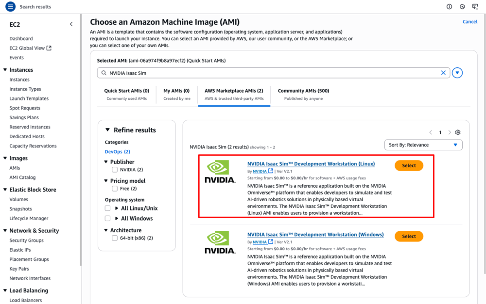 部署路径:AWS控制台 → EC2 → 启动实例 → 浏览其他AMI → AWS Marketplace AMI → 搜索”NVIDIA Isaac Sim”