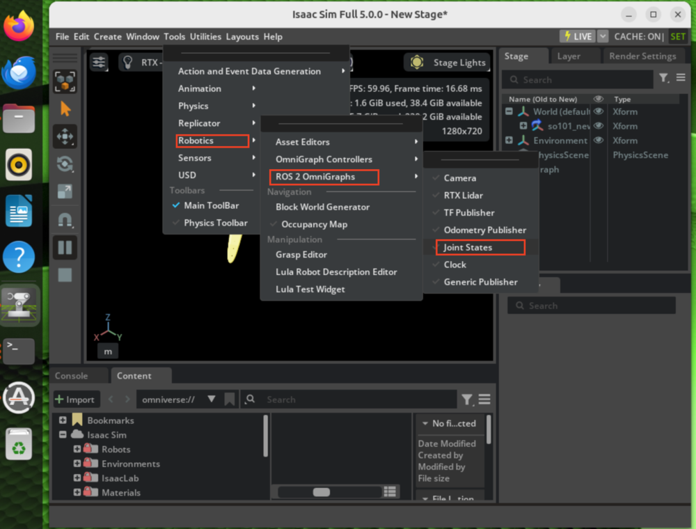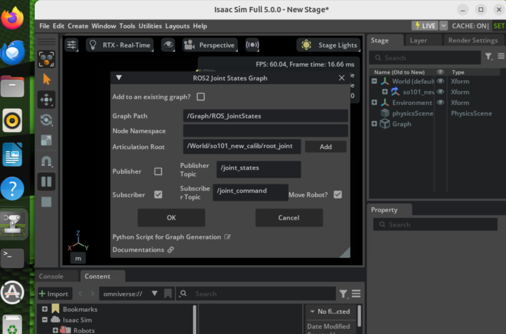 关节状态订阅配置:Tools → Robotics → ROS2 OmniGraphs → Joint States