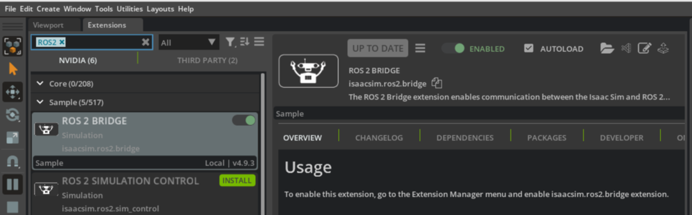 ROS2 Bridge扩展激活:Window → Extensions → 搜索”ROS 2 Bridge” → 启用”isaacsim.ros2.bridge”