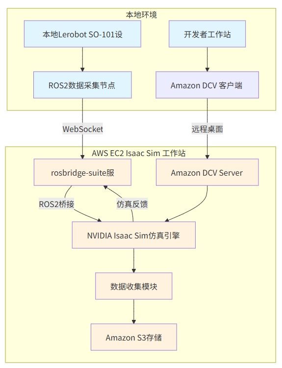 该架构通过AWS EC2构建云端Isaac Sim仿真环境,实现本地机器人设备与云端仿真的无缝集成,支持远程开发和数据收集。