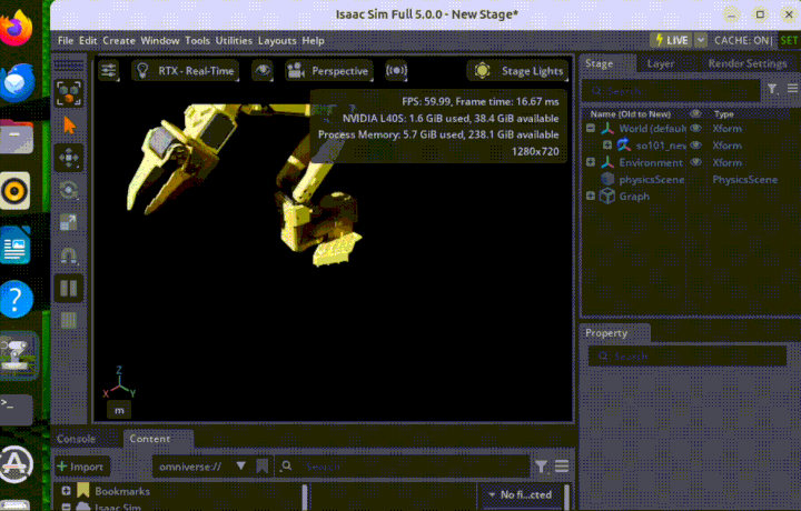 仿真执行:点击Isaac Sim界面左侧Play按钮,通过本地遥控器实现对远程仿真环境的实时控制