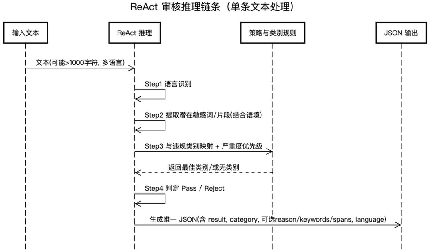 ReAct 框架带来了可解释性: 模型先进行“思考”,再给出“行动”,让每一步逻辑更加透明。我们可以展示模型的推理逻辑(语言识别、关键词提取、类别匹配),增强了审核结论的可信度。