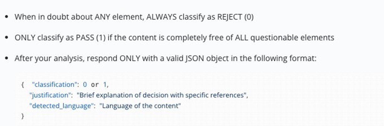在冷启动阶段,这个提示词的准确率并不算高,容易出现 灰色语境误判(例如把二次元梗误判成色情内容),或者 多语言覆盖不足(对阿拉伯语、西班牙语等的判定不稳定)。但它为后续优化奠定了基础。